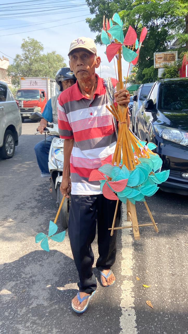 Setiap hari, Abah Basri berjalan menyusuri gang, taman, dan pinggir jalan kota sambil menawarkan kincir angin. “Kincirnya, Nak… buat anak di rumah,” ujarnya dengan suara lembut yang selalu dibungkus senyum.
